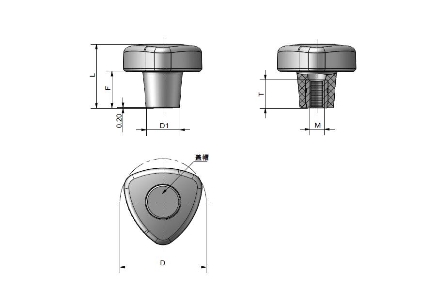 蓋帽可摘掉利用,帶弧形三面區(qū)域的旋鈕,外觀靚麗,易于緊固