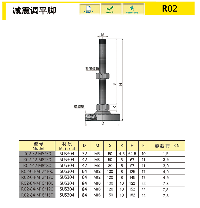 | 型號(hào) | 材質(zhì) | 直徑D | M | S | K | H | h | 重量(g) | 靜載荷(KN) | 3D圖紙 | 選購 | |||